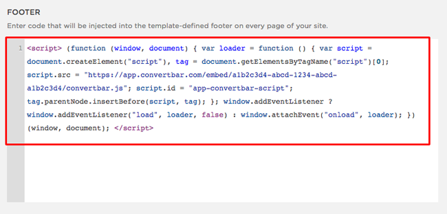Paste your ConvertBox embed code into the second box down, labelled Footer, then press save at the top.